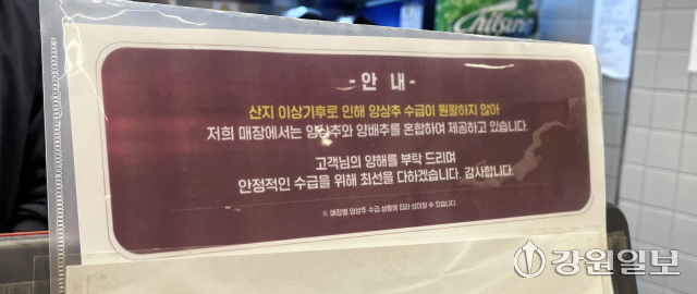 26일 찾은 춘천의 한 롯데리아 매장. 키오스크 옆에는 ‘산지 이상기후로 인해 양상추 수급이 원활하지 않아 양상추와 양배추를 혼합해 제공하고 있습니다’라는 안내문이 붙어 있었다.