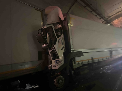 ◇26일 오전 5시30분께 홍천군 내촌면 서울양양고속도로 양양방향 화촌9터널에서 A(57)씨가 몰던 4.5톤 화물차가 2차로에 정차해 있던 4.5톤 트럭을 들이받았다. 사진=강원도소방본부 제공