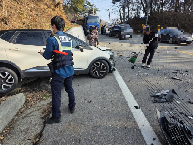 ◇26일 오후 2시13분께 횡성군 우천면 국도 6호선에서 QM3 승용차와 무쏘 스포츠 차량이 부딪쳐 3명이 다쳤다. 사진=강원도소방본부 제공
