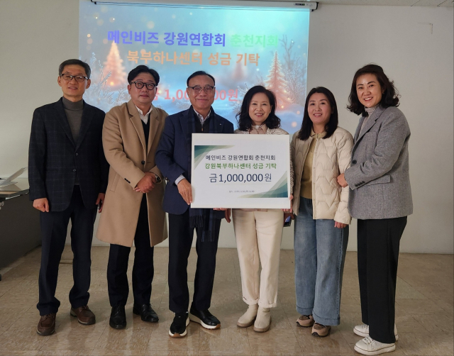 메인비즈 강원연합회 춘천지회(회장:엄성철)는 26일 강원북부하나센터 회의실에서 강원북부하나센터에 북한이탈주민의 안정적인 자립을 위한 성금 100만원을 전달했다.