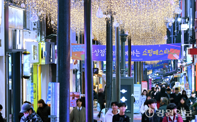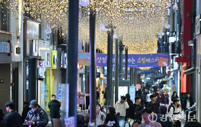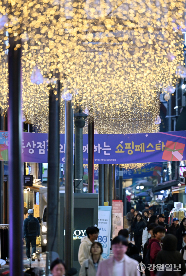 연말연시가 다가오고 있는 가운데 26일 경관조명이 화려하게 불을 밝힌 춘천시 명동거리가 쇼핑을 나온 시민들로 북적이고 있다.