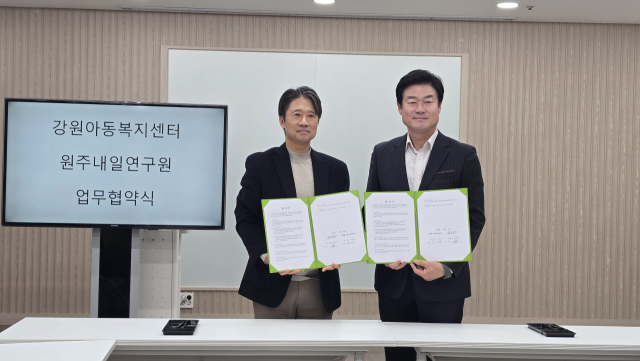 (사)원주내일연구원과 굿네이버스 강원아동복지센터는 27일 굿네이버스 강원아동복지센터 회의실에서 구자열 이사장과 임진묵 센터장 등이 참석한 가운데 도내 요보호 아동, 학대피해 아동, 돌봄취약 아동의 건강한 성장과 복지 증진을 위한 업무협약(MOU)을 했다.