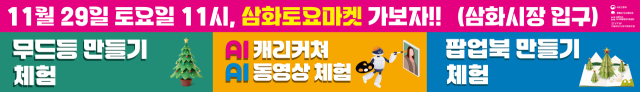 정하연 시 도시정비과장은 “삼화토요마켓은 시민들의 관심과 참여 덕분에 골목상권에 큰 힘이 됐다”며 “올해 마지막 행사인 만큼 참가해 따뜻한 시간, 소중한 추억을 만들고 가시길 바란다”고 말했다.