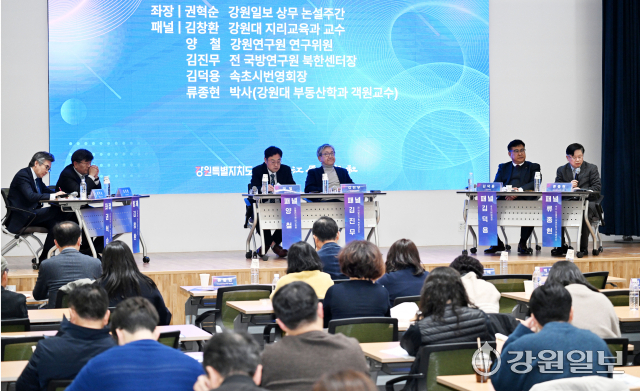 '2025 DMZ 규제완화와 발전 전략 포럼'이 지난 27일 강원연구원에서 열린 가운데 권혁순 강원일보 상무 논설주간을 좌장으로 한 종합토론이 함께 진행돼 의미를 더했다. 류종현 박사와 양철 강원연구원 연구위원, 김진무 전 국방연구원 북한센터장, 김덕용 속초시번영회장, 김창환 강원대 지리교육과 교수 등은 접경지역 인재 양성, 남북 관계 이해, 주도적인 변화 의지 등 새로운 발전 동력을 찾기 위한 다양한 의견을 내놓았다.