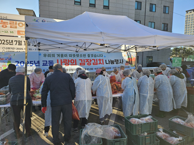속초시 교동주민자치위원회(위원장:이민섭)는 28일 교동주민센터 주차장에서 지역 내 기초생활수급자와 차상위계층 등 110가구에 전달할 사랑의 김장김치 나누기 행사를 개최했다.