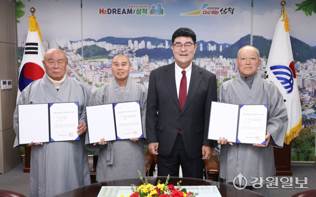 박상수 삼척시장은 지난 28일 시장 집무실에서 ‘삼척 영은사 석조비로자나삼불좌상’, ‘삼척 신흥사 석조석가여래삼존좌상’, ‘삼척 감로사 원당도’ 등 신규 지정된 도지정 문화유산의 지정서를 전달했다.