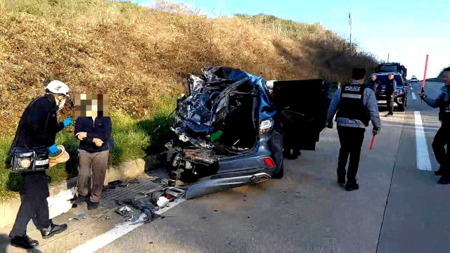 ◇1일 오후 2시19분께 삼척시 근덕면 7번 국도에서 25톤 트럭과 SUV가 충돌했다. 사진=강원특별자치도소방본부 제공