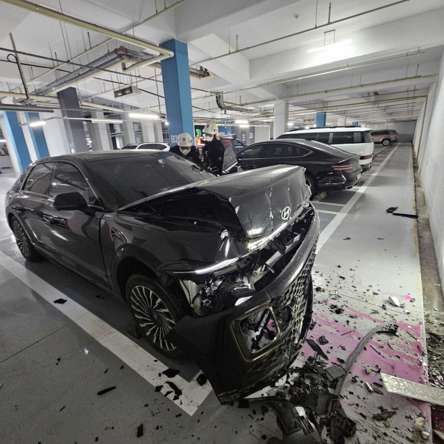 ◇1일 오전 11시47분께 원주시 단구동의 한 아파트 지하주차장에서 C(57)씨가 몰던 그랜저 승용차가 벽면을 들이받았다. 사진=강원특별자치도소방본부 제공