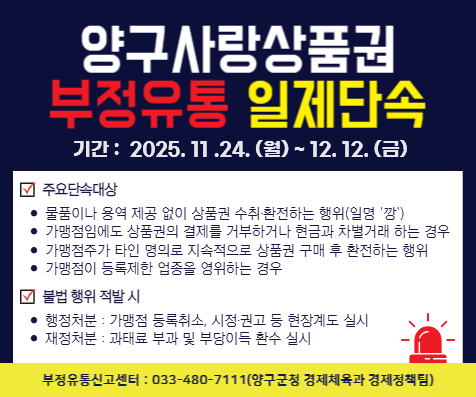 이에 군은 오는 12일까지 양구사랑상품권 부정 유통에 대한 집중 단속에 나선다. 이번 단속은 상품권의 부정 유통을 근절하고 건전한 상품권 유통질서를 확립해 지역사랑상품권의 지속가능성 및 신뢰성을 확보하기 위해 마련됐다.