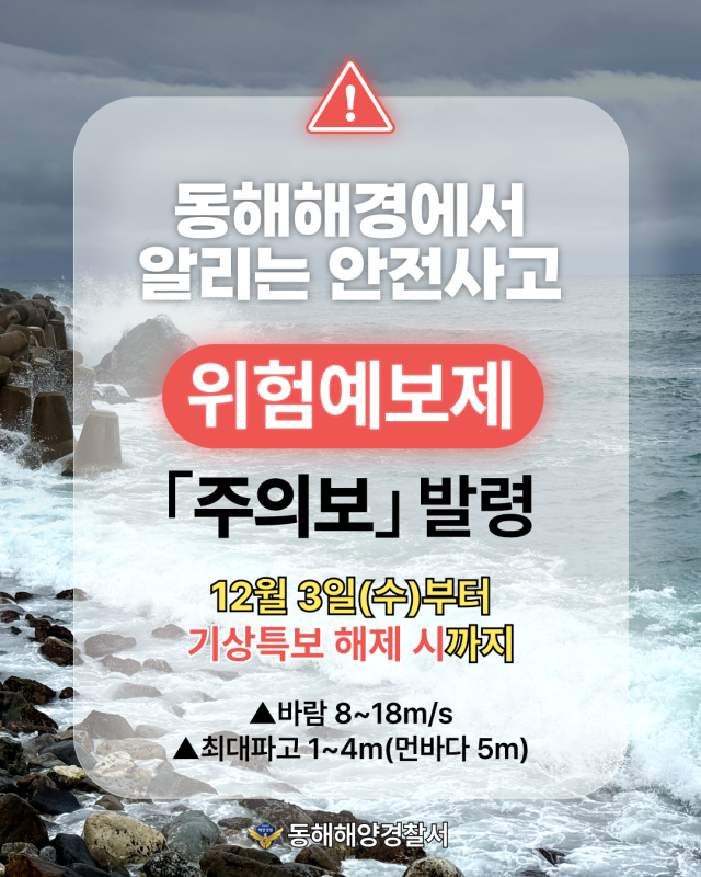동해해양경찰서는 동해중부전해상 풍랑예비특보 발표에 따라 안전사고 위험예보제 ‘주의보’ 단계를 3일부터 기상특보 해제시까지 발령한다.