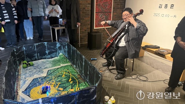 지역 내 지적발달장애인들이 참석한 가운데 김 작가는 첼로 연주를 배경으로 RC카의 움직임을 즉흥적으로 조율하며 바퀴가 남긴 흔적이 캔버스 위에서 새로운 선과 면을 만들어내는 과정을 공개했다. 작품을 통해 자폐1급 중증장애로 인해 수동적일 수밖에 없는 삶의 조건 속에서 ‘어떻게 주체적인 선택을 할 수 있는가’라는 질문을 던졌다. 올해 인공지능과의 협업을 통해 RC카의 움직임을 설계하고 해석하는 반복 작업을 진행하며 ‘스스로 명령하고 결정할 수 있는 영역’을 확장하는 시도를 이어가고 있다. 전시는 오는 14일까지 이어진다.