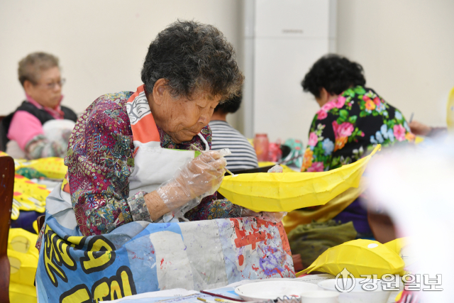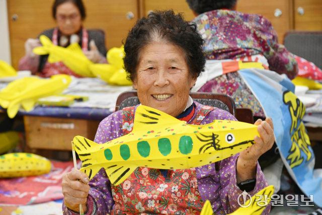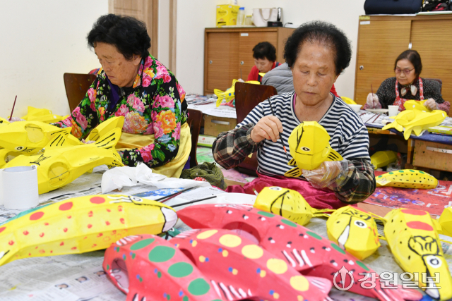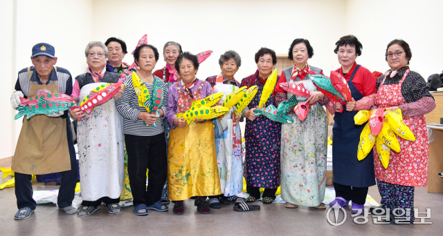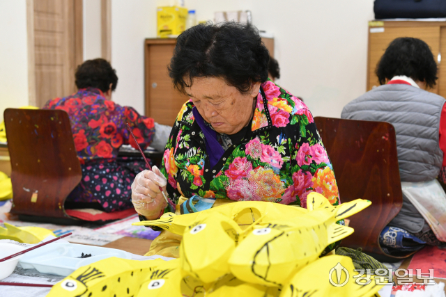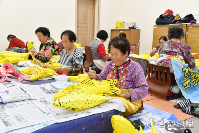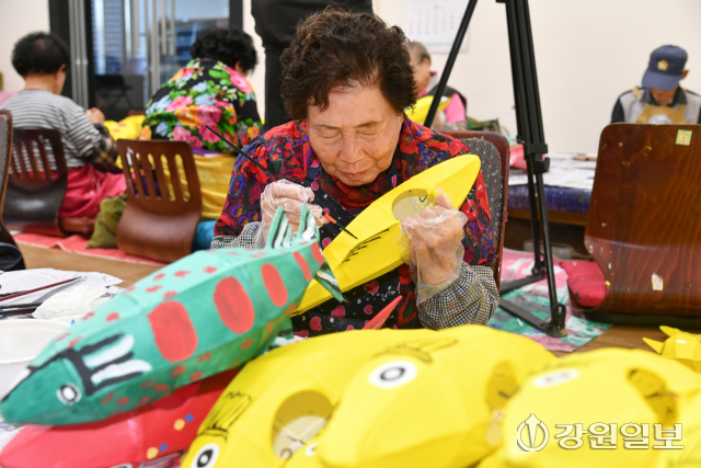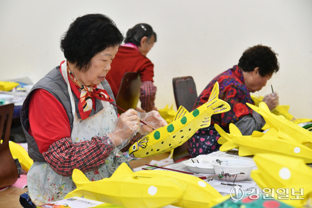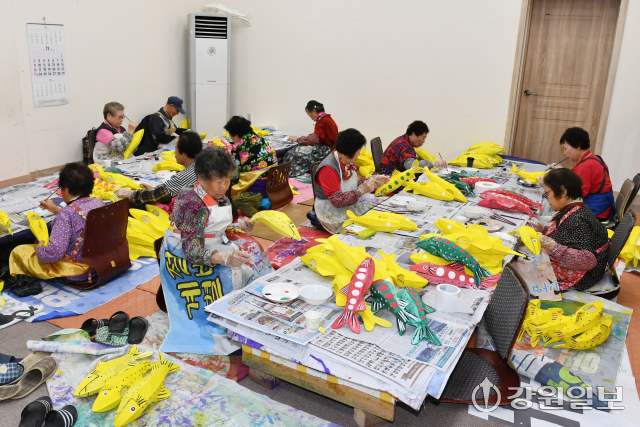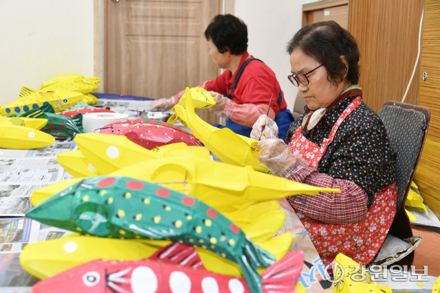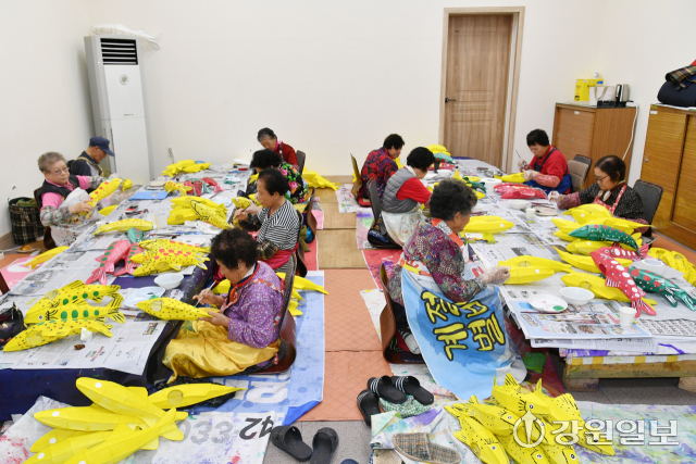 ◇화천읍 산천어 공방에서 어르신들이 축제에 사용될 산천어등을 만들고 있다.