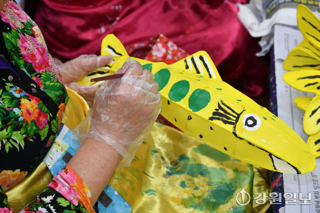 또 손수 붓을 들어 등불의 몸통에 산천어 특유의 문양을 그려 넣고, 눈동자를 채워 생기를 불어 넣고 있다.