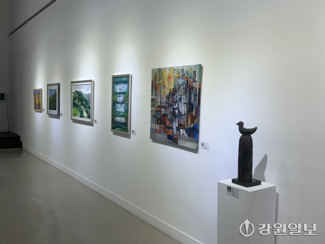 지난달 28일부터 ‘뿌리와 기억’을 주제로 열리고 있는 이번 전시는 근현대 미술의 흐름을 이어온 원로 작가들이 각자의 작품을 통해 시대의 변화와 함께 성장해 온 창작 세계를 선보였다. 회원들의 작업은 춘천이라는 도시가 지나온 시간과 삶의 흔적을 품은 하나의 ‘기억의 미술관’으로 자리하며 예술에 새겨진 기억의 힘을 드러냈다. 전시에는 구자근, 김광남, 오흥구, 안종중, 박순배, 전태워, 최영식, 이종봉, 이정여 등 총 43명의 작가가 참여했다. 작가의 작업 속에는 지난 시대의 냄새, 소양강 물빛, 도시를 감싸는 숨결과 온기 등이 스미고 작가 개인의 기억이 모여 춘천이라는 공동체 안에서 하나의 예술사로 이어졌다. 한편 올해 별세한 이운식(강원대 명예교수) 상임고문과 진성자(강원대 명예교수) 작가를 기리는 추모전도 함께 마련됐다. 두 작가의 작품은 여전히 살아 있는 이야기로 전시 공간에 머물며 관람객의 발길을 멈추게 했다.