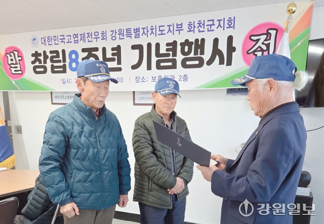 고엽제전우회 화천군지회(지회장:오기동) 창립 8주년 기념 행사가 3일 화천보훈회관에서 열려 김영춘 전 군지회장과 신덕조 군지회 사무장이 강원서부보훈지청장 표창을 받았다.