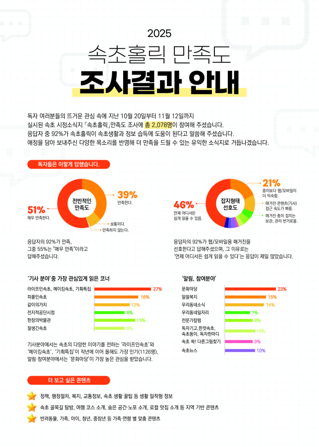 속초시는 지난 10월 20일부터 11월 12일까지 23일간 ‘2025년 속초홀릭 만족도 설문조사’를 진행하고 이에 대한 분석을 마쳤다.