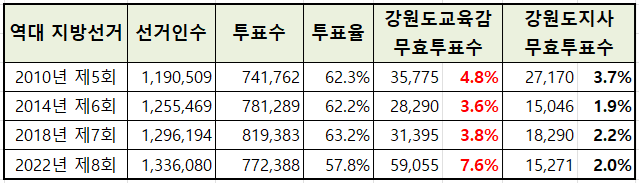 중앙선거관리위원회 자료에 따르면 직선제로 전환된 2010년 이후 네 차례의 선거에서 후보 선택을 포기한 유권자의 무효투표수가 강원도지사보다 강원도교육감이 줄곧 더 높았다.