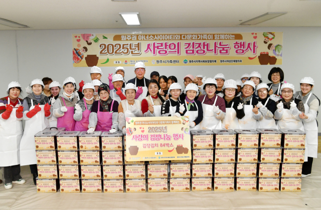 이날 원강수 원주시장과 원주권 아너소사이어티, 다문화가족, 원주시가족센터, 원주시여성단체협의회 등의 자원봉사자들이 직접 참여해 이웃사랑을 실천했다. 만들어진 김치 840㎏은 원주시가족센터를 통해 다문화가족 84가정에 전달된다.