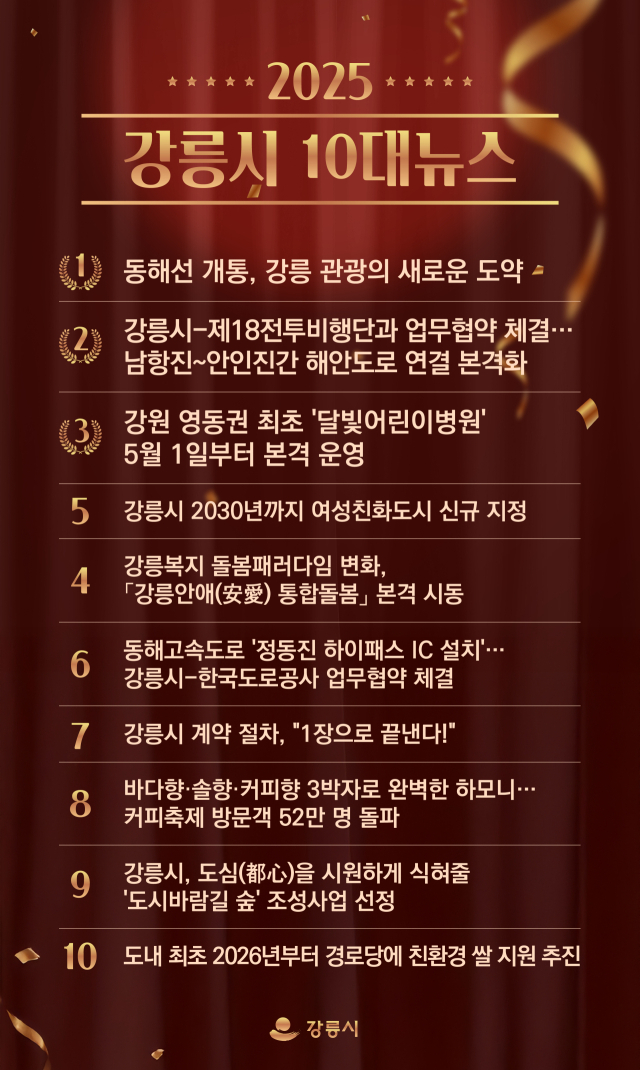 시 관계자는 “올 한 해 강릉의 변화를 이끈 10대 뉴스는 공직자와 시민이 함께 만들어 낸 성과”라며 “이번 결과를 토대로 행정의 사각지대를 더욱 세심하게 살피고, 시민 누구나 일상에서 변화를 체감할 수 있도록 ‘더 큰 강릉, 더 따뜻한 강릉’을 향한 정책을 한층 속도감 있게 추진하겠다”고 말했다.