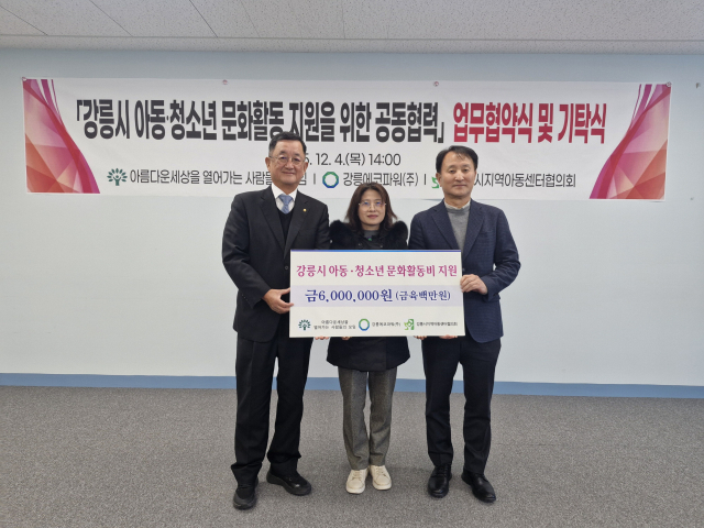 아름다운세상을 열어가는 사람들의 모임(대표:김형익)과 강릉에코파워㈜(대표:장용창)는 4일 강릉시청 15층 회의실에서 강릉시지역아동센터협의회(대표:백은정)와 아동·청소년 문화복지 증진을 위한 업무협약을 맺고 각 300만원의 성금을 기탁했다.