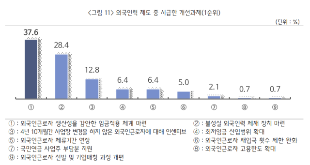 중소기업들의 불성실한 외국인력에 대한 제재장치 마련 등 관련 제도 개선이 시급한 것으로 나타났다.