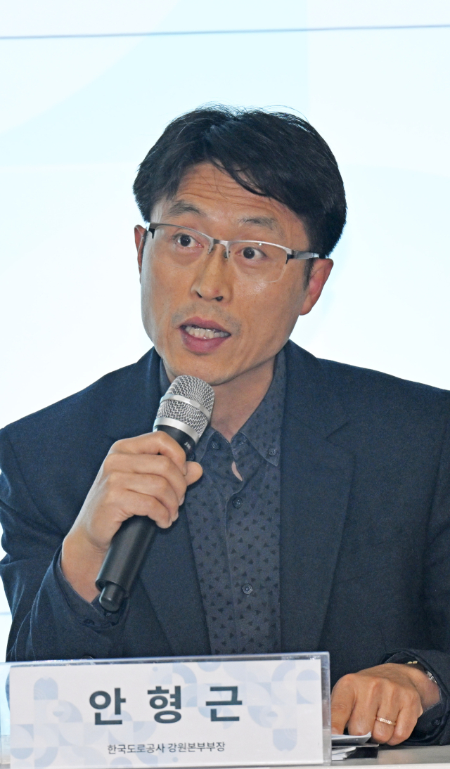 안형근 한국도로공사 강원본부 부장=“영동고속도로는 산악 지형 특성상 교량·터널이 많고 기상 악화에 취약해 유지 관리가 쉽지 않다. 평창올림픽을 앞두고 전면적인 시설 개량을 했지만, 앞으로는 GPR 탐사 등을 통해 보이지 않는 교량 바닥판까지 리모델링하는 정밀 안전 관리를 추진할 계획이다. 제천~영월 고속도로는 내년 본격 착공하고, 영월~삼척 구간은 예타를 통과해 타당성 평가를 앞두고 있다. 완공까지 10년 이상 걸리는 장기 사업이지만 지역 균형 발전을 위해 차질 없이 진행하겠다.”
