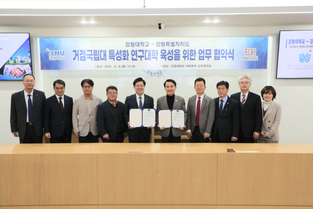 강원특별자치도와 강원대는 8일 강원대 대학본부 3층 교무회의실에서 ‘거점국립대 특성화 연구대학 육성을 위한 업무협약’을 체결했다.