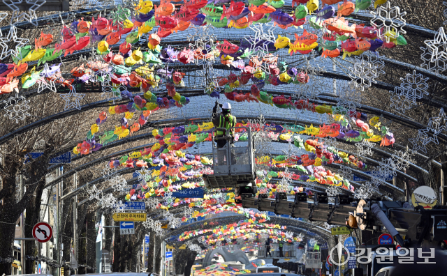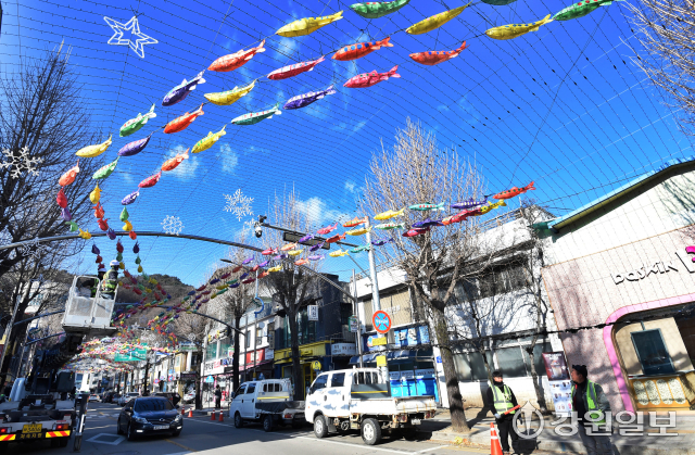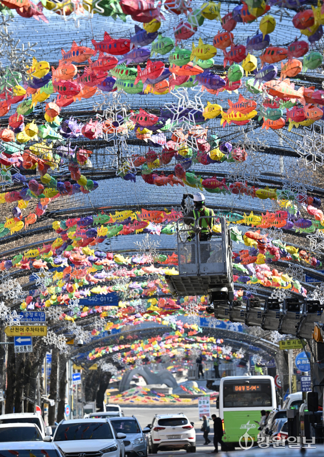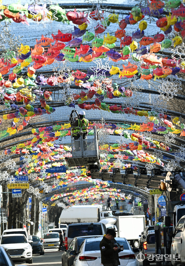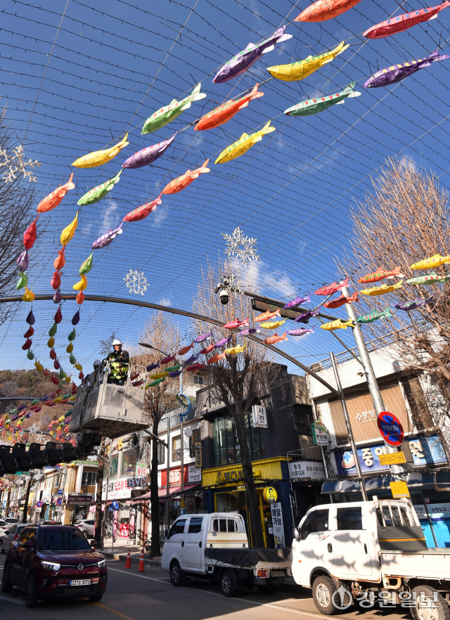 9일 화천군 화천읍 중앙로 선등거리에 산천어등이 설치 되고 있다. 2026 얼음나라 화천산천어축제 서막을 알리는 선등거리 점등식은 오는 20일 열린다.