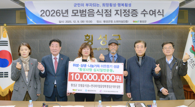 횡성지역 모범음식점 업주들과 외식업중앙회 횡성군지부 임원들은 지난 9일 모범음식점 지정증 수여식 자리에서 이웃사랑 성금 1,000만원 전달했다. 이날 기부는 외식업의 경기가 어려운 여건 속에서도 지역사회에 보답하겠다는 소상공인들의 뜻이 모여 의미를 더했다.