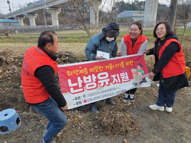 구정면지역사회보장협의체(공동위원장:박인순, 민간위원장:김남득)은 10일 겨울철 복지사각지대 해소를 위해 우리동네1촌 사업장 5개소 및 지역 내 주요 사업장 방문 캠페인을 실시했다. 이어 강원도공동모금회의 후원으로 취약계층 5가구에 난방유를 지원하여 따뜻한 겨울나기를 위한 맞춤형 지원도 병행했다.