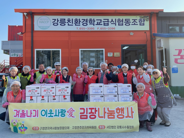 강릉시 구정면주민자치위원회(위원장:김나경)와 구정면지역사회보장협의체(위원장:김남득)는 10일 지역내 취약계층의 따뜻한 겨울나기를 돕기위해 (사)강릉시수출협회 후원으로 ‘겨울나기 이웃사랑愛 김장김치 나눔행사’를 진행, 지역 내 홀몸어르신, 한부모가정 등 취약계층에게 김장김치를 전달해 겨울철 식생활 부담을 덜어주고 따뜻한 정을 나눴다.