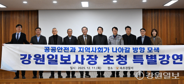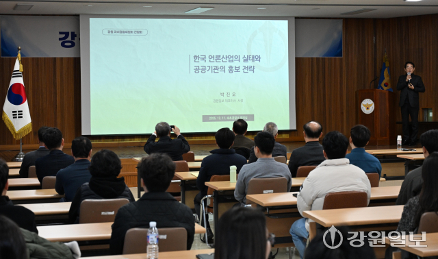 박진오 강원일보 사장이 11일 속초경찰서에서 열린 강원 자치경찰위원회 간담회에서 '한국 언론산업의 실태와 공공기관의 홍보 전략'을 주제로 강연했다. 신세희기자
