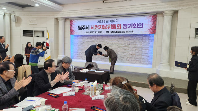 원주시시정자문위원회(회장:이강모)는 11일 원주 빌라드아모르에서 원강수 원주시장, 위원 등 30여명이 참석한 가운데 정기회의를 진행했다. 이날 박춘자 부위원장이 2025년 3분기 시 정기포상을 수상했으며, 방종준 위원이 위촉장을 받았다.