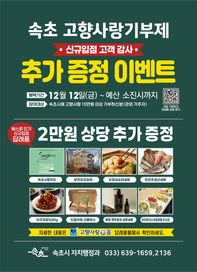 고향사랑e음 사이트를 통해 속초에 고향사랑기부를 하고 신규 답례품을 주문하면 추가 답례품을 증정받을 수 있다.