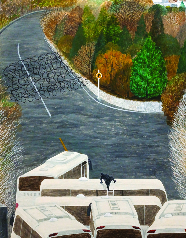 화천의 농민화가이자 화천 곡운구곡의 고장을 대표하는 작가로 알려진 길종갑 화백은 인간의 끝없는 탐욕과 욕망을 비판적으로 응시하며 다양한 존재들을 바라보고 함께 살아가야 한다는 이야기를 담아낸다. 광주의 조정태 작가는 지난 10여 년간 이어온 ‘별이 된 사람들’ 연작을 통해 역사적 상처와 희생의 기억을 성좌처럼 엮어내, 그의 ‘별’은 반드시 기억되어야 할 상징으로 자리매김 한다. 진주의 노경호 작가는 계엄 정국 당시 중계된 장면들을 기록하며, 반복돼서는 안 될 역사적 순간을 화폭 속에 남겼다.
