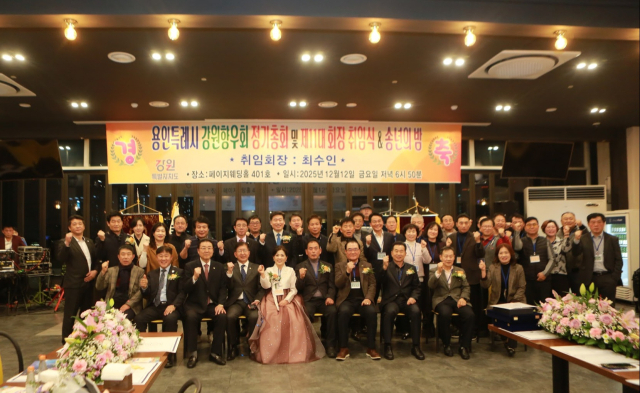 용인특례시 강원향우회(회장:최수인)는 지난12일 용인 페이지웨딩홀에서 제11대 최수인 회장(연임)의 취임식을 겸한 '2025 송년의 밤'행사를 개최했다. 이날 행사에는 이상일 용인시장 및 지역 국회의원, 시의원 등 내빈과 회원 등이 참석했으며 회원들은 동해시에 지역 발전을 위한 고향사랑기부금을 전달했다.
