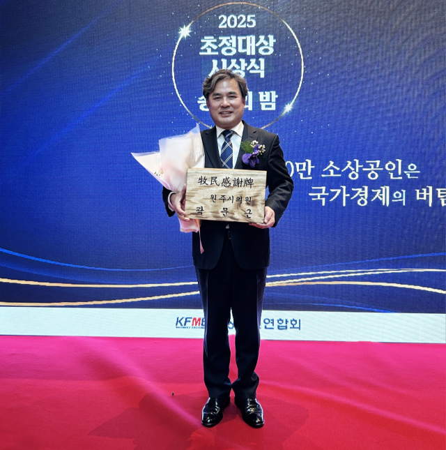 【원주】곽문근 원주시의회 부의장은 지난 12일 서울 페어몬드 엠버서더 호텔에서 열린 전국소상공인연합회 주관 '2025 목민감사태 시상식'에서 목민감사패를 수상했다.