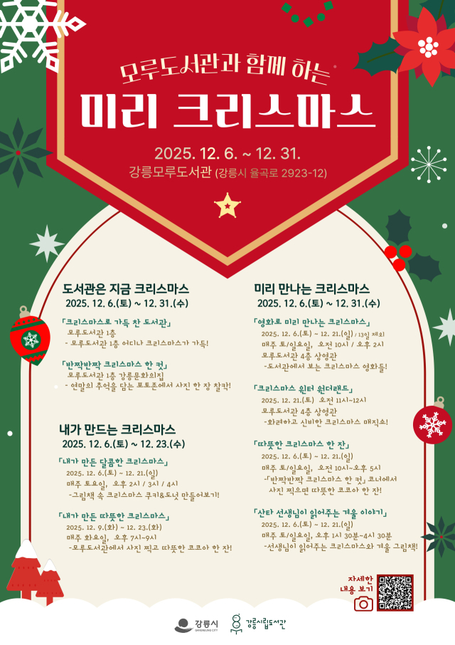 강춘랑 강릉시립도서관장은 “12월에도 가족과 함께 즐길 수 있는 겨울 시즌 프로그램이 한 달간 이어진다”며 “도서관에서 책과 함께 2025년을 마무리하고 희망찬 2026년을 준비해보면 좋겠다”고 말했다.