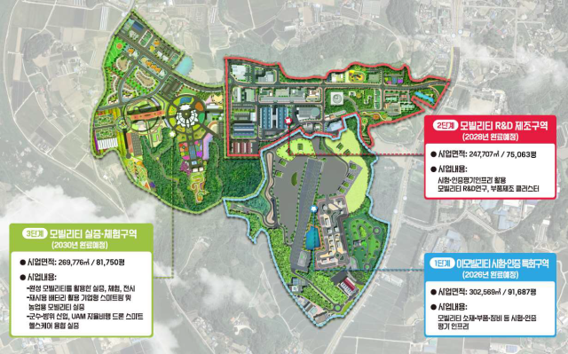 3단계는 모빌리티 실증·체험구역으로 군수·방위산업, UAM·자율비행 드론, 농업용 모빌리티 등 실증구역과 재사용 배터리 활용 기업형 스마트팜 및 주민소득 연계사업을 구상 중이다.