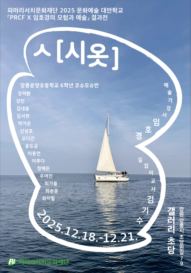 (재)파마리서치문화재단(이사장:박필현)은 18일부터 21일까지 강릉 초당동에 위치한 갤러리 초당에서 「PRCF X 임호경의 모험과 예술」 결과전 ‘ㅅ[시옷]’을 개최한다고 밝혔다. 이번 전시는 강릉운양초교 6학년 ‘코슈모슈’반 어린이들이 약 두 달간 참여한 문화예술 대안학교의 결과물을 공개하는 자리로, 예술가 임호경과 함께한 창작 여정의 결실이다. ‘시옷’이라는 전시 제목은 말과 글, 그리고 생각의 시작점이 되는 ‘ㅅ’의 상징성과 함께, 바다 위 돛처럼 상상의 항해를 이끄는 힘을 표현하고 있다.