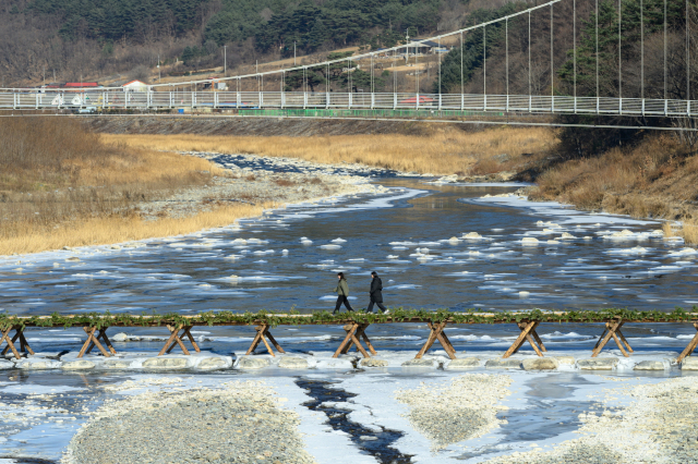 【정선】 정선아리랑의 발상지 아우라지의 오랜 전통인 아우라지 섶다리가 전통방식 그대로 재현돼 겨울 관광객들을 유혹하고 있다.