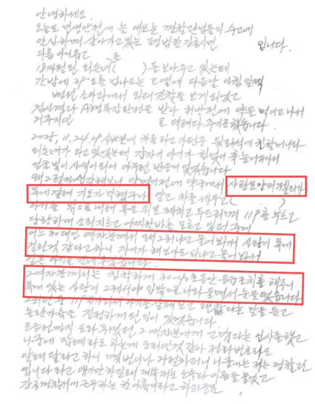 당시 감사 인사를 전하며 도와주신 분이 누구인지 묻는 조부모의 요청에 한사코 신분을 밝히길 거절하던 한 경사는 거듭된 물음에 강릉경찰서에서 근무하는 경찰임을 밝혔고, 이를 기억한 조부모는 며칠 뒤, 경찰서에 직접 작성한 감사 편지를 보내 고마움을 전했다.