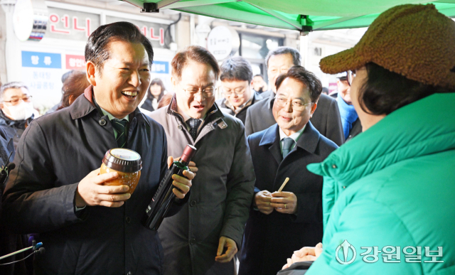17일 춘천 풍물시장을 찾은 정청래 더불어민주당 대표와 허영 국회의원, 황명선 국회의원, 육동한 시장이 핫바를 먹으며 민심을 청취하고 있다. 신세희기자17일 춘천 풍물시장을 찾은 허영 국회의원이 정청래 더불어민주당 대표에게 홍어무침을 권하고 있다. 신세희기자17일 춘천 풍물시장을 방문한 정청래 더불어민주당 대표와 허영 국회의원, 육동한 시장이 장을 보며 민심을 청취하고 있다. 신세희기자17일 춘천 풍물시장을 방문한 정청래 더불어민주당 대표와 허영 국회의원, 육동한 시장, 유정배 춘천·철원·화천·양구 을 지역위원장이 장을 보며 민심을 청취하고 있다. 신세희기자
