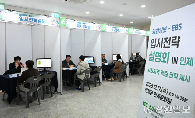 17일 인제문화원에서 열린 강원일보-EBS 입시전략설명회 IN인제에 참여한 학생들이 정유빈 EBSi 수학영역 대표강사의 학습법 강의를 듣고 있다. 신세희기자17일 인제문화원에서 열린 강원일보-EBS 입시전략설명회 IN인제에 참여한 학생들이 정유빈 EBSi 수학영역 대표강사의 학습법 강의를 듣고 있다. 신세희기자17일 인제문화원에서 열린 강원일보-EBS 입시전략설명회 IN인제에 참여한 학생들이 대학 입시·진로 상담을 받고 있다. 신세희기자