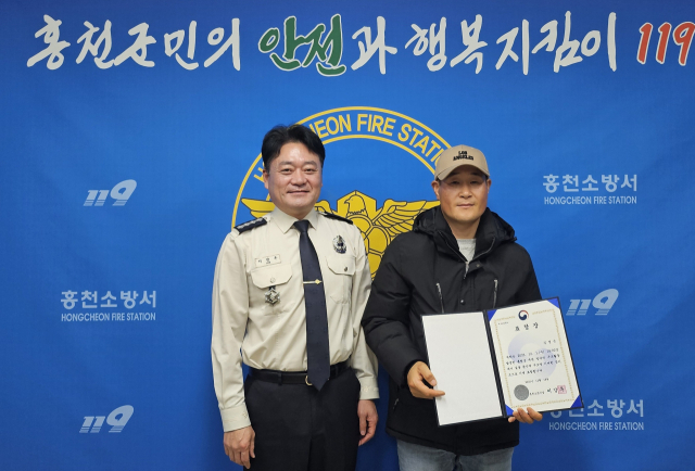 홍천소방서는 18일 서내에서 내면 방내리 주민인 김영곤(47)씨에게 서장 표창을 수여했다. 김 씨는 지난 10월 1일 오후 4시께 마을 야산에서 실종된 등산객을 찾는 작업에 기여했다.