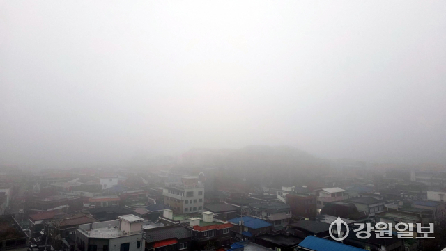 오전 동안 짙은 안개가 낀 18일 춘천시 후평동에서 본 도심이 한치 앞도 보이지 않는다. 신세희기자