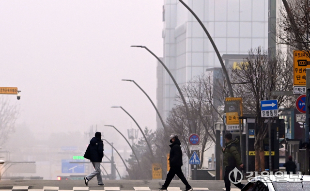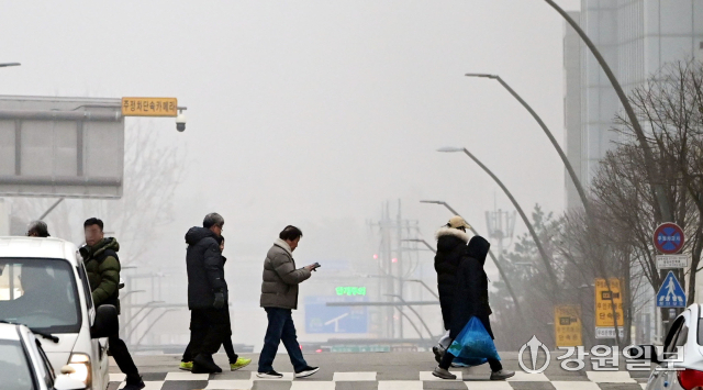 겨울철 일교차와 습한 날씨로 짙은 안개가 발생하는 날이 많아지면서 시민들의 호흡기 건강관리에 각별한 주의가 요구되고 있다. 18일 오전 춘천시 중앙로에서 시민들이 뿌옇게 흐린 안개속을 걸어가고 있다. 신세희 기자
