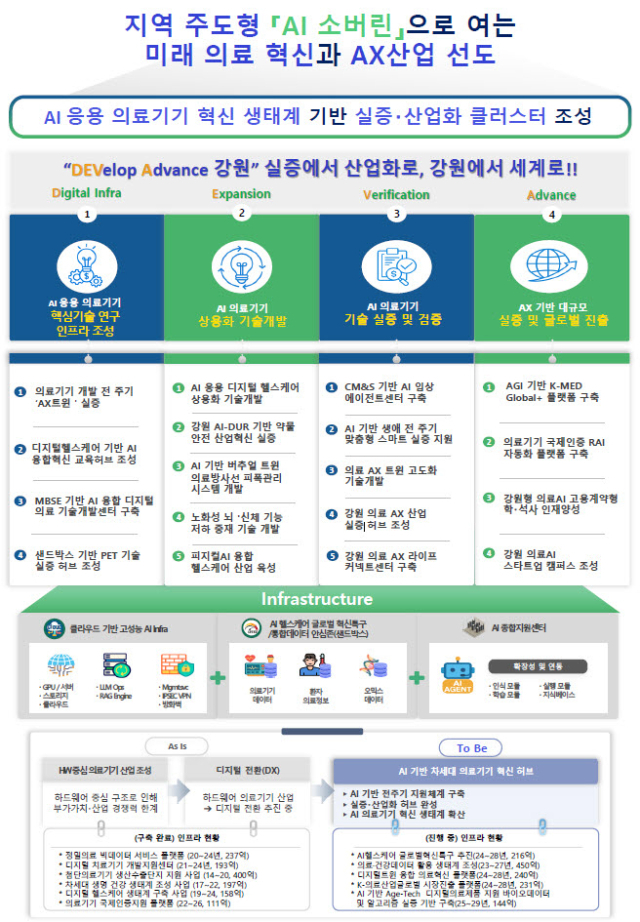 이달 초 도는 5,800억원 규모의 강원 의료 AX 첨단 산업 육성 프로젝트를 준비 중으로, 이에 필요한 의료 AI 선도지구 지정을 위해 종합 계획 연구 용역을 착수했다고 밝혔다. 도는 의료 AX 육성 세부 과제로 18개 사업을 공개했다.