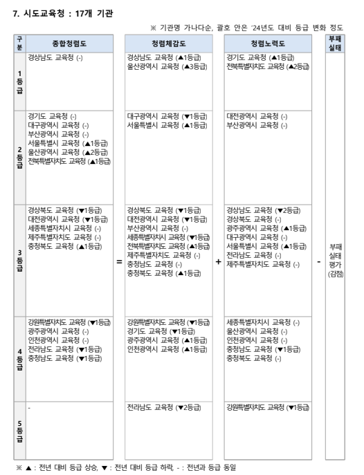 이번 평가는 전국 중앙행정기관과 지방자치단체, 교육청 등 709곳 공공기관을 대상으로 실시됐으며 종합청렴도는 △청렴체감도 △청렴노력도 △부패실태 평가를 종합해 1~5등급으로 나뉜다. 등급 하락은 해당 기관의 청렴 수준이 상대적으로 후퇴했음을 의미한다.