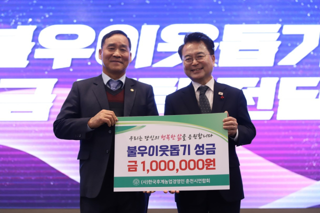 【춘천】 (사)한국후계농업경영인 춘천시연합회(회장:신성호)는 23일 스카이컨벤션웨딩홀에서 ‘제33회 후계농업경영인 춘천시연합회 한마음대회’를 개최했다. 이날 연합회는 지역사회와의 상생을 위해 춘천시에 불우이웃돕기 성금 100만 원을 기탁했다.